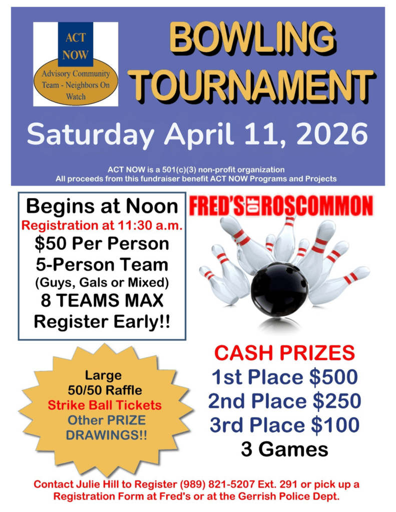Come out and join the fun! All proceeds from this Bowling Tournament Fundraiser will help support ACT NOW annual community programs and projects. ACT NOW is a non-profit organization that works in coordination with the Gerrish Township Police Department.